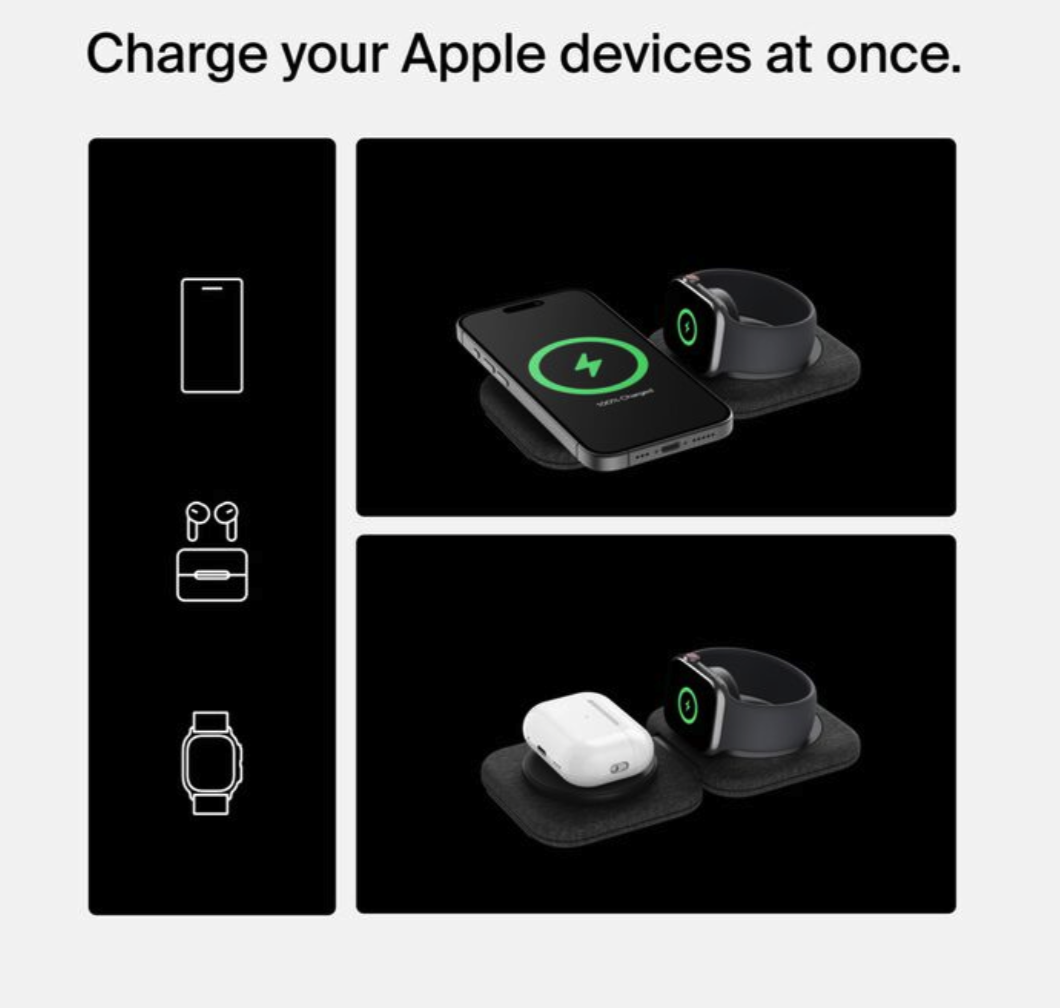• Fast charge iPhone up to 15W using Qi2 and charge Apple Watch Series 7, 8, 9 and Ultra 1 and 2